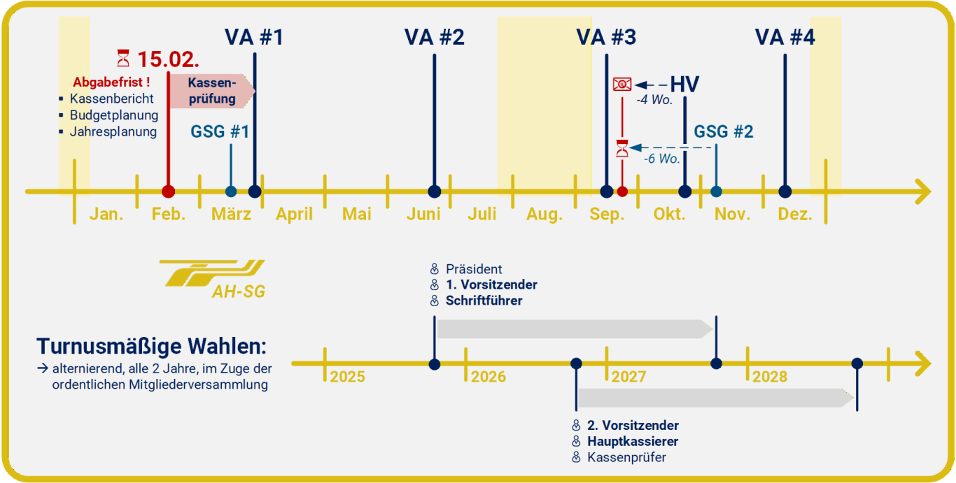 Im Zeitdiagramm (unten) sollen die Meilensteine eines "Standard-Geschäftsjahres" veranschaulicht werden, mit regelmäßig vier VA-Sitzungen, einer ordentlichen Mitglieder(haupt)versammlung (HV), zwei Sitzungen mit der GSG (Frühjahr und Herbst), sowie ausgewählten Frist(termin)en: